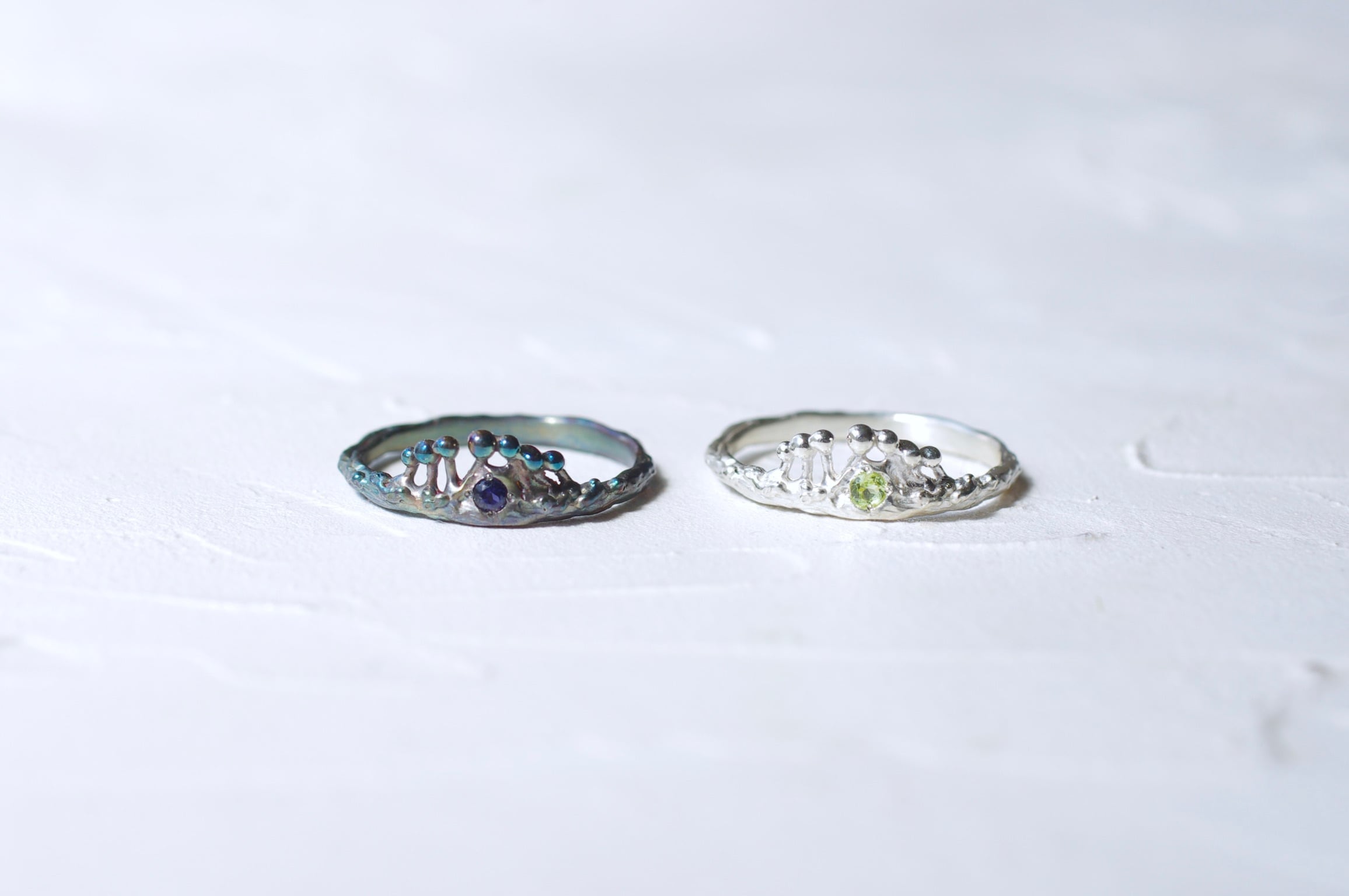 瑠璃色の構造色が魅力の「ルリホコリ」をモチーフにしたリング。