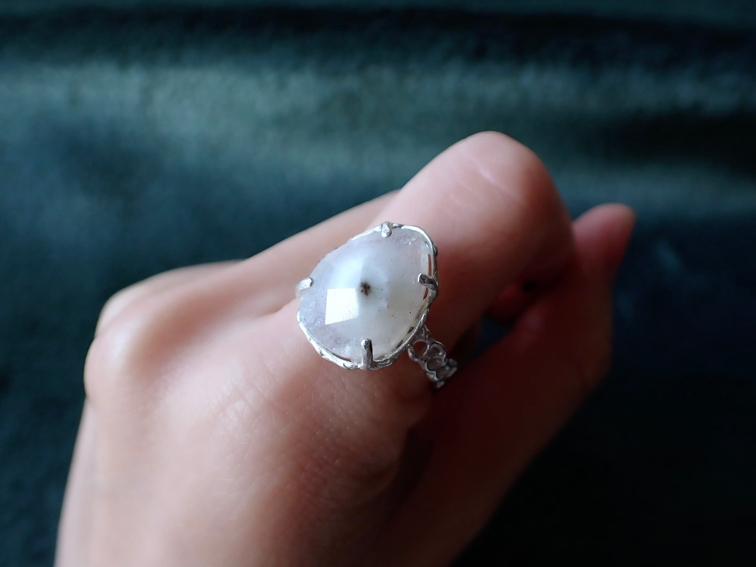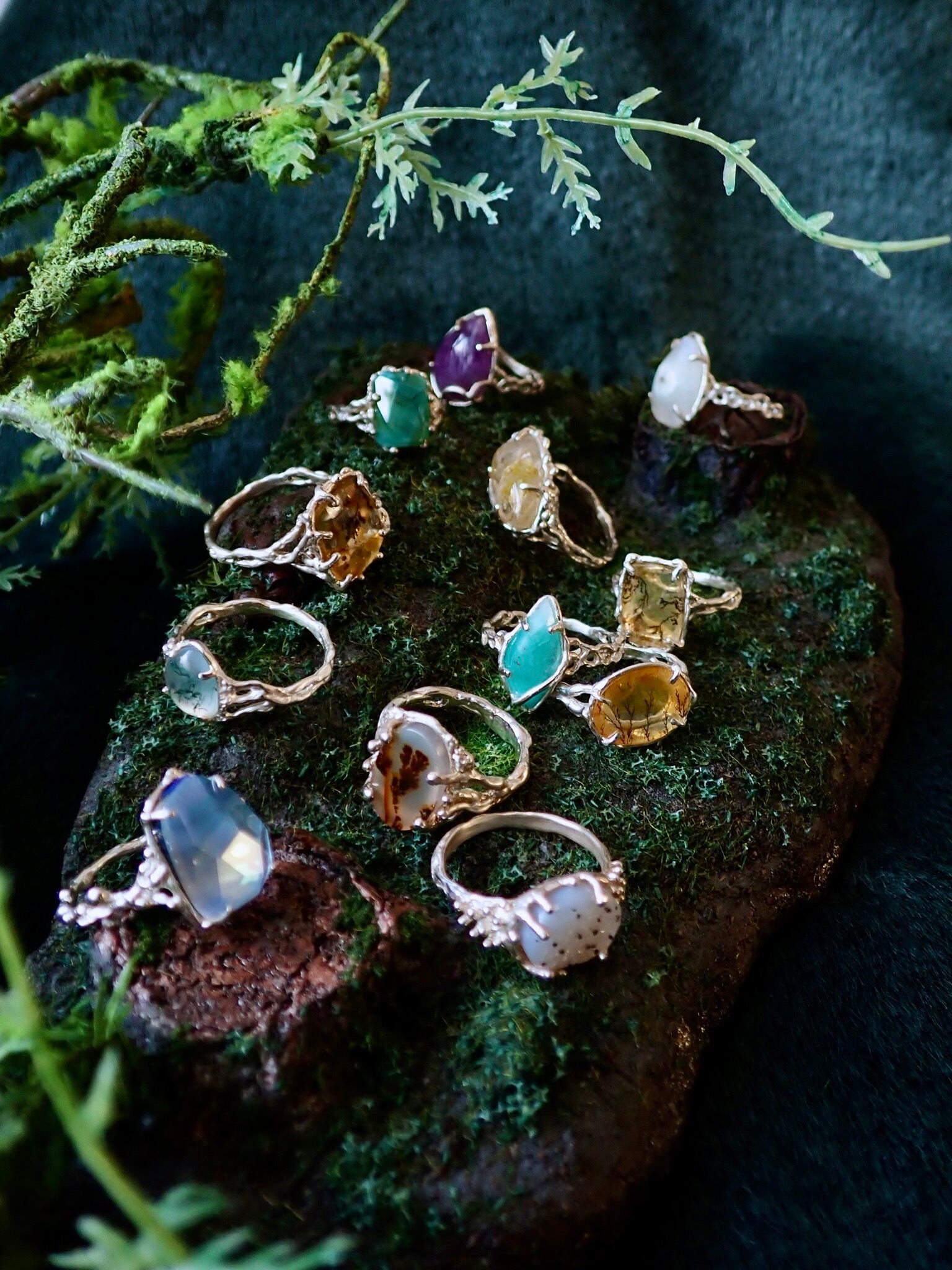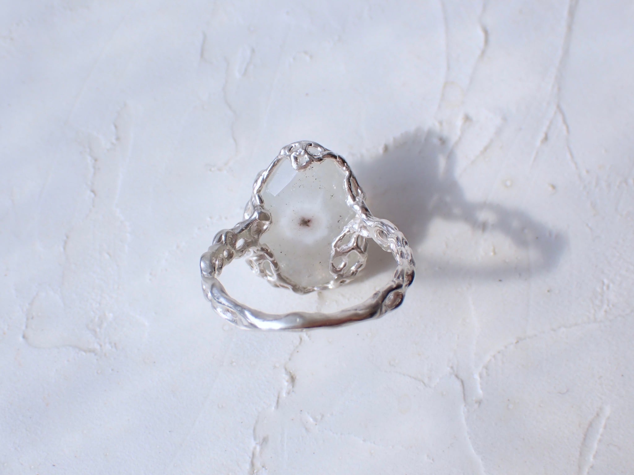 mineral meshリングは、ヘビヌカホコリという粘菌が張り巡らせる網目状のかたちから着想を得て、自然の中に存在する“見えない流れ”を表現した一点です。