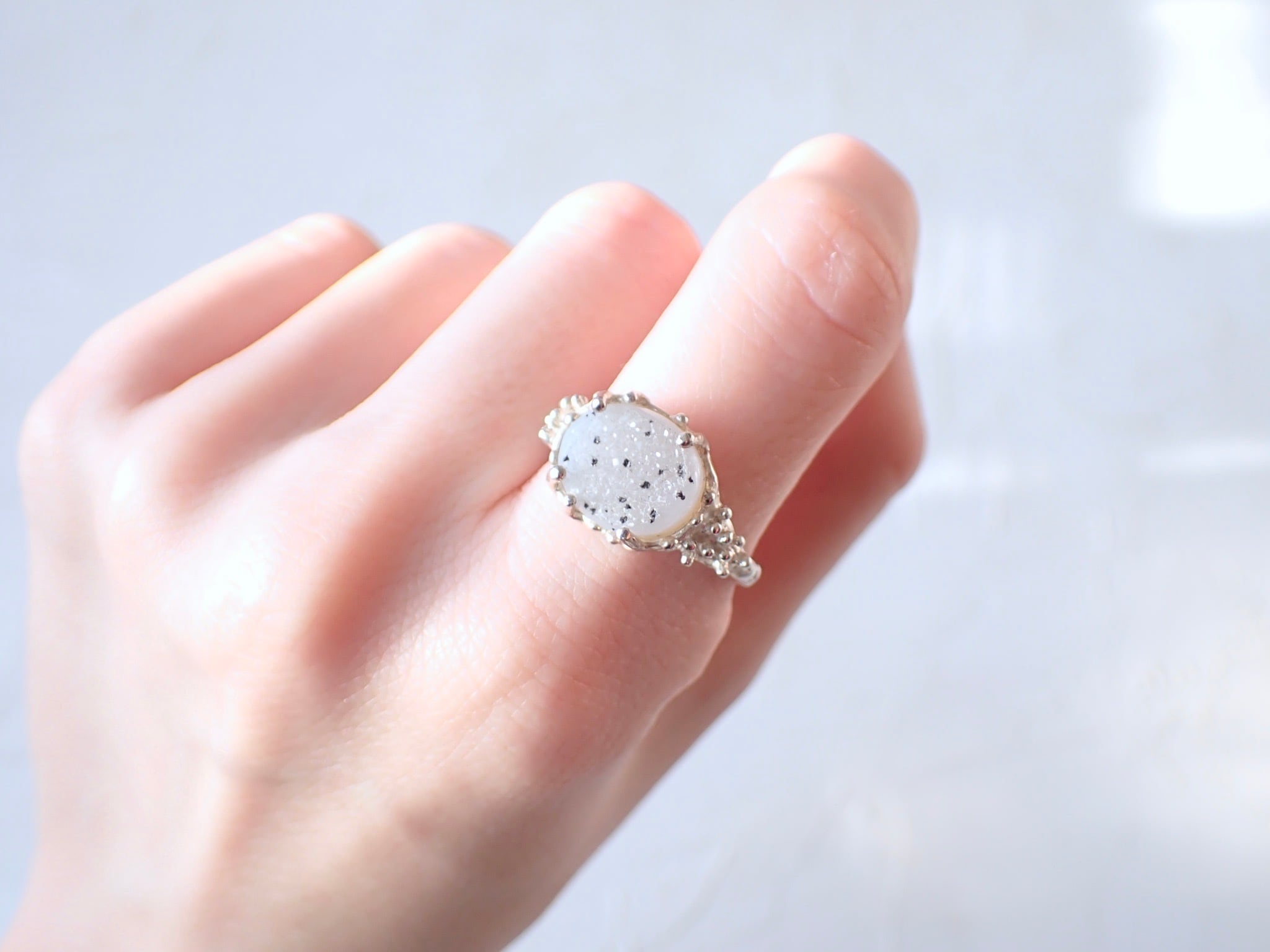 mineral hornリングは、粘菌の「ツノホコリ」の仲間の一種、エダナシツノホコリをイメージし、ニョキニョキと地表から立ち上がる姿をそのまま造形に落とし込んだ、生命感あふれる天然石リングです。
