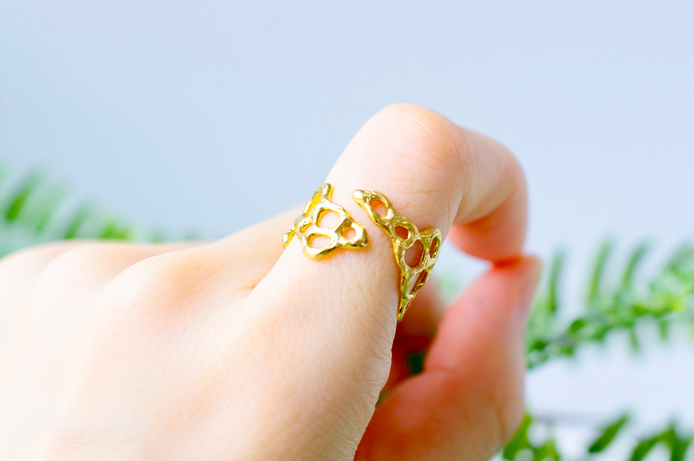 幾何学模様のようなデザインで、着用すると指にまとわりつくように見えます。