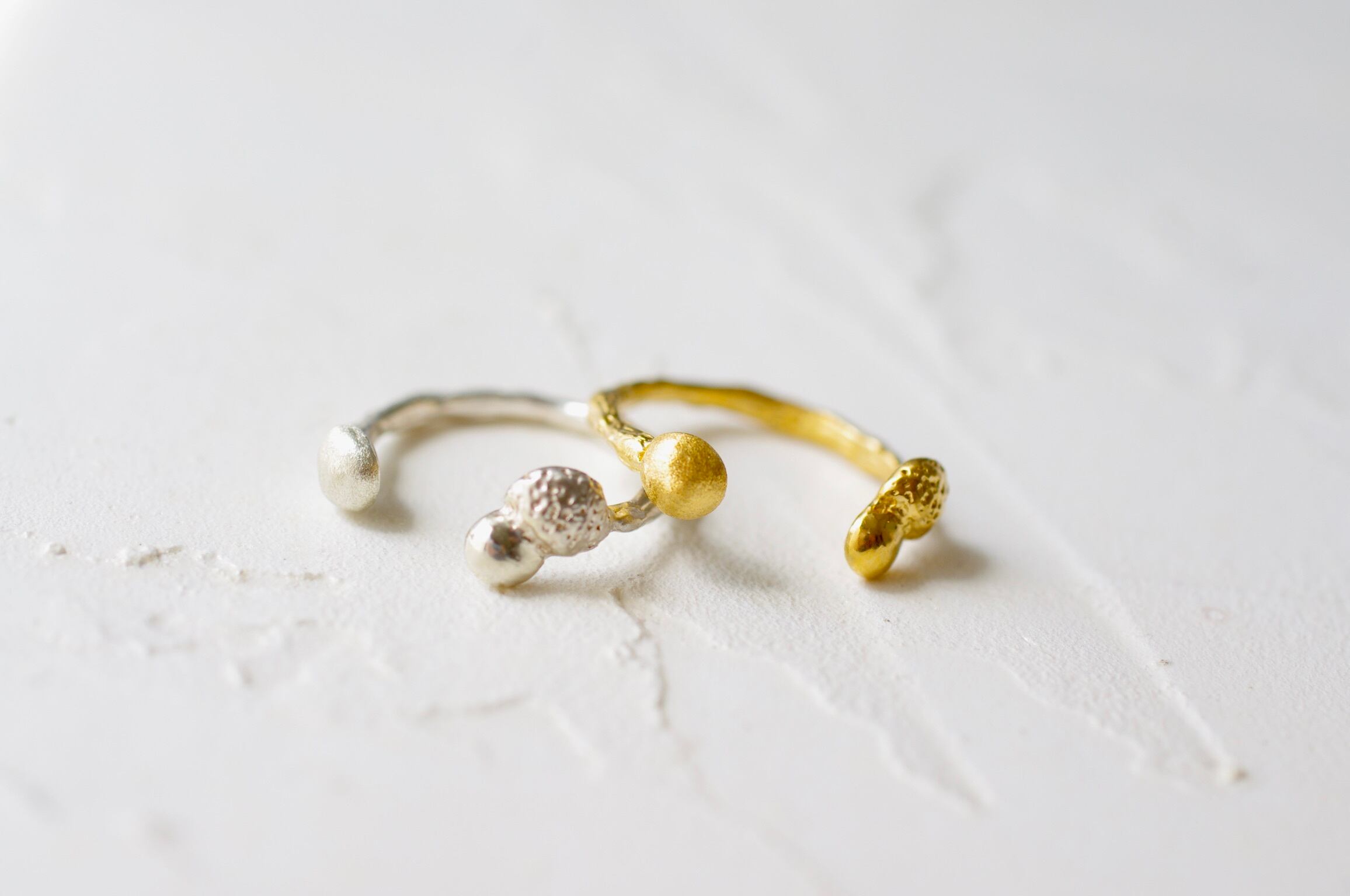 "マメホコリ"という粘菌をモチーフにした、複数が寄り添って生きているように見えるピンキーリングです。