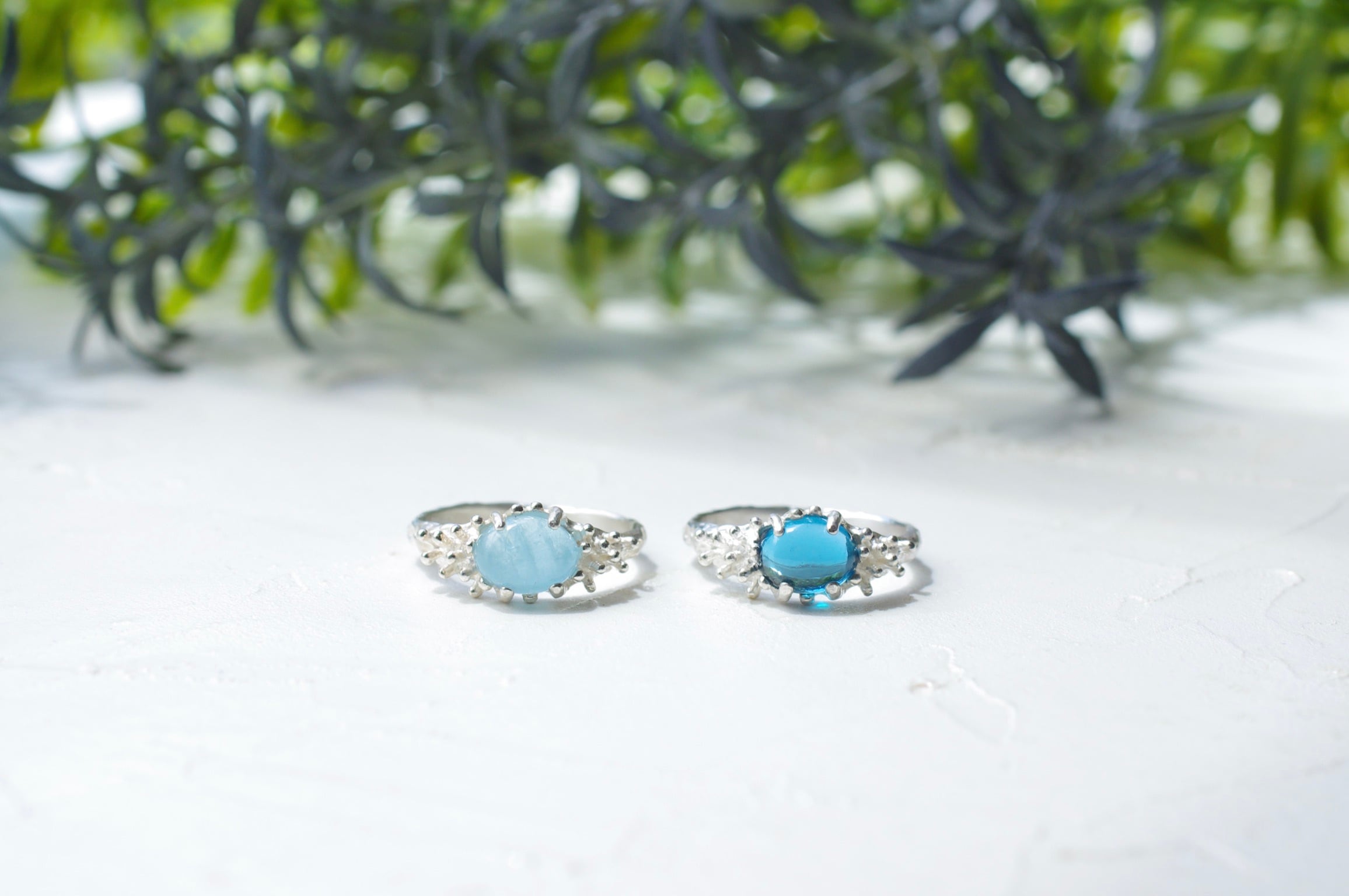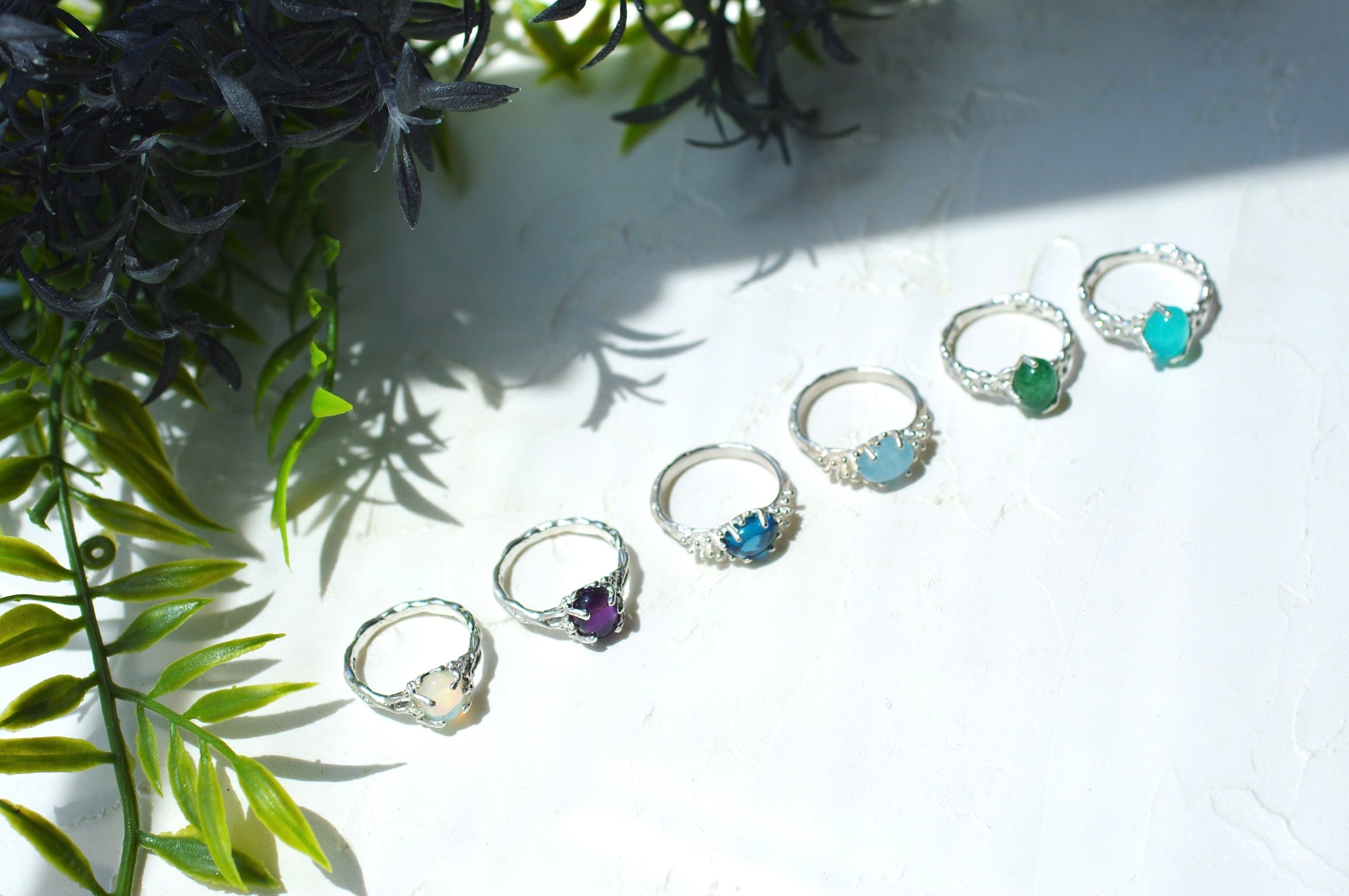 mineral hornリング《アクアマリン》は、粘菌の「ツノホコリ」の仲間の一種のエダナシツノホコリをイメージした、ニョキニョキと生えるデザインが特徴的な天然石リングです。