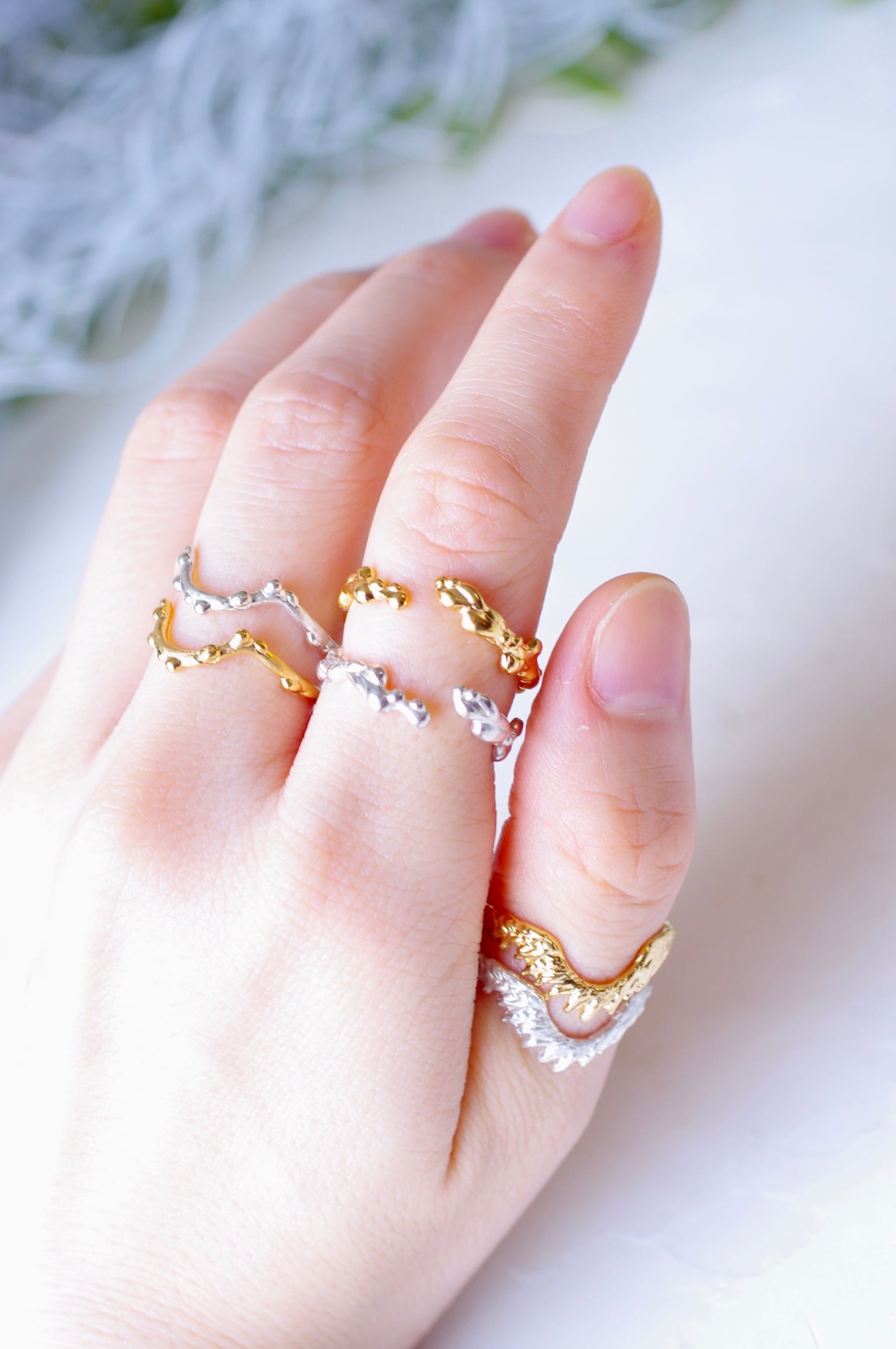苔を伝い、光を受けて飛び散る水の飛沫をモチーフにしたリングです。