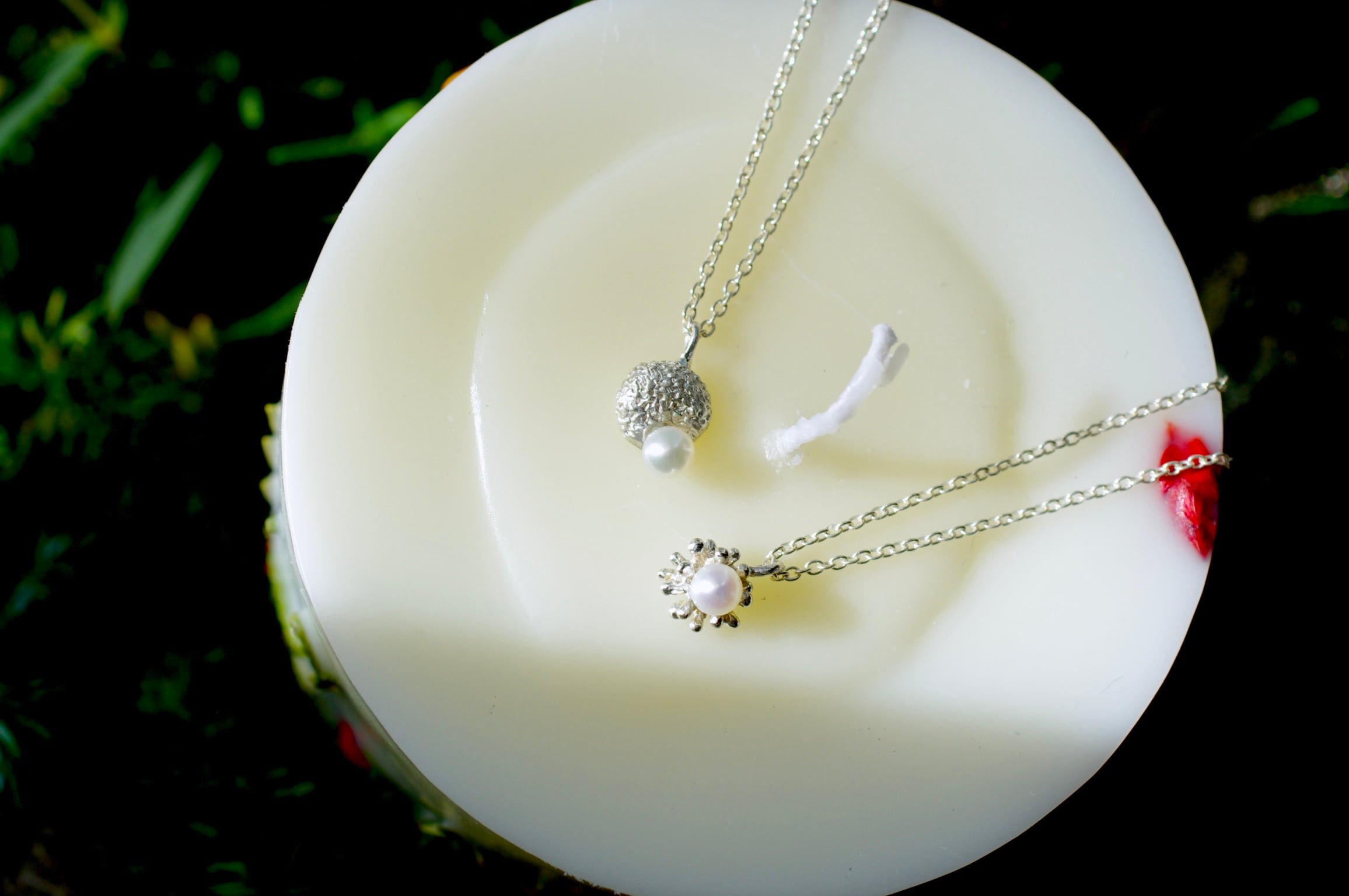 "マメホコリ"という、つぶつぶぷっくりとしたかわいらしい粘菌をモチーフにした、淡水パール付きの一粒ネックレスです。